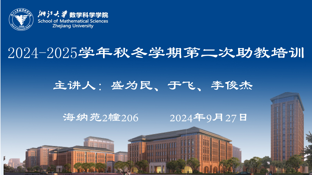 本科生 信息公告 教研动态 代数和几何系列 分析和方程系列 统计学系列 信息与计算科学系列 微积分系列 线性代数系列 高等数学系列 微分方程与复变函数系列 其他 学籍管理 实践教学 对外交流 培养方案 政策文件 会议纪要 其他 首页 > 2024-2025学年秋冬学期第二次助教培训会议 来源:数学科学学院 发布时间:2024-09-29 104